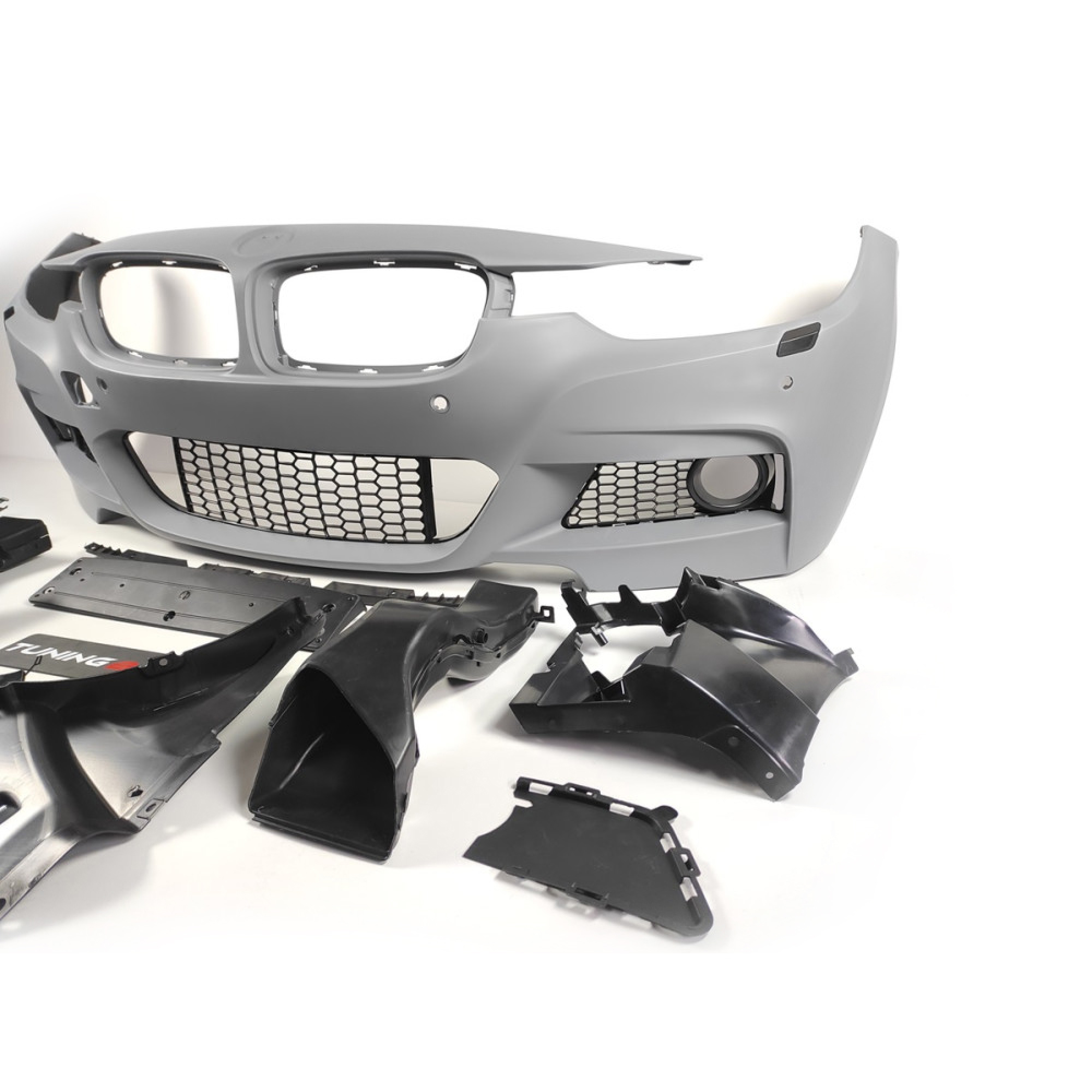 Nadaj swojemu BMW Serii 3 F30 sportowy i dynamiczny wygląd w stylu M-Pakiet dzięki kompletnemu zestawowi bodykit. Zestaw zawiera zderzaki przedni i tylny oraz progi boczne, co pozwala na pełną transformację wizualną pojazdu. Przedni zderzak posiada otwory na czujniki parkowania (PDC) oraz miejsca na światła przeciwmgielne (fog lamps) – idealnie dopasowany do fabrycznych mocowań.