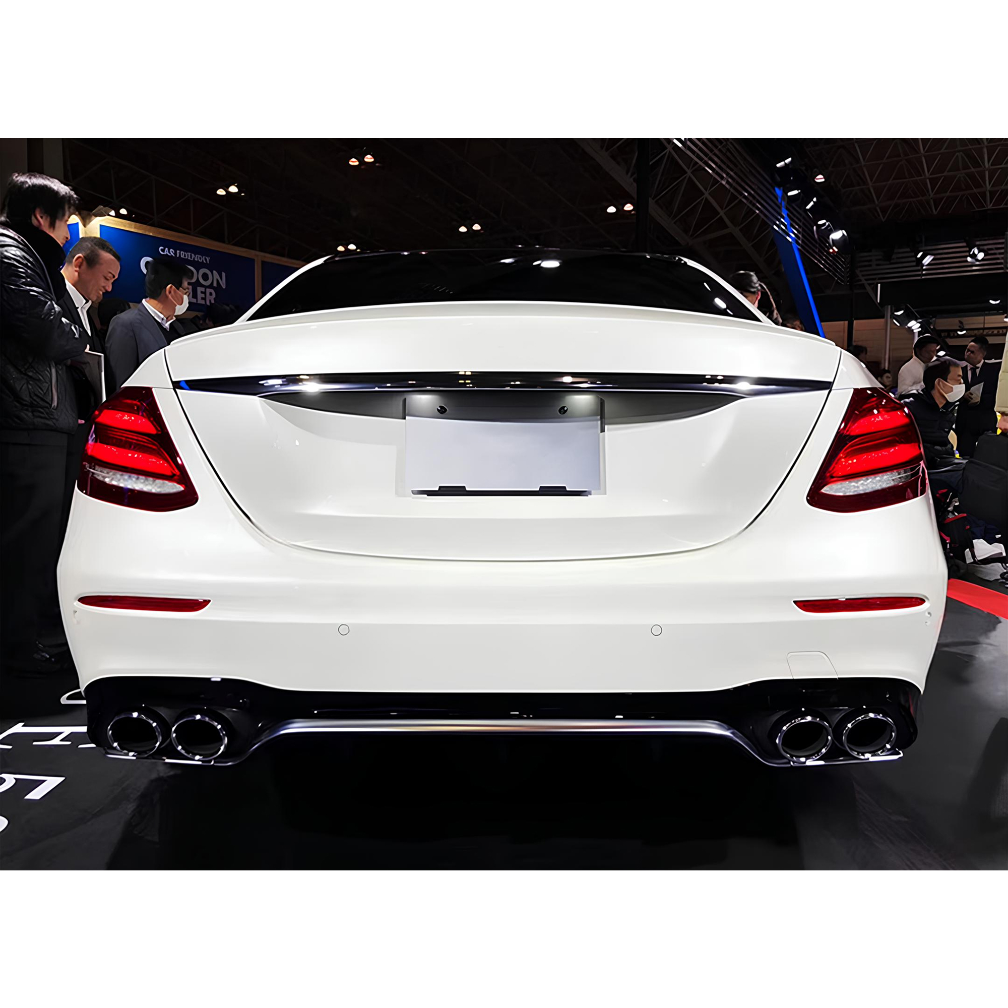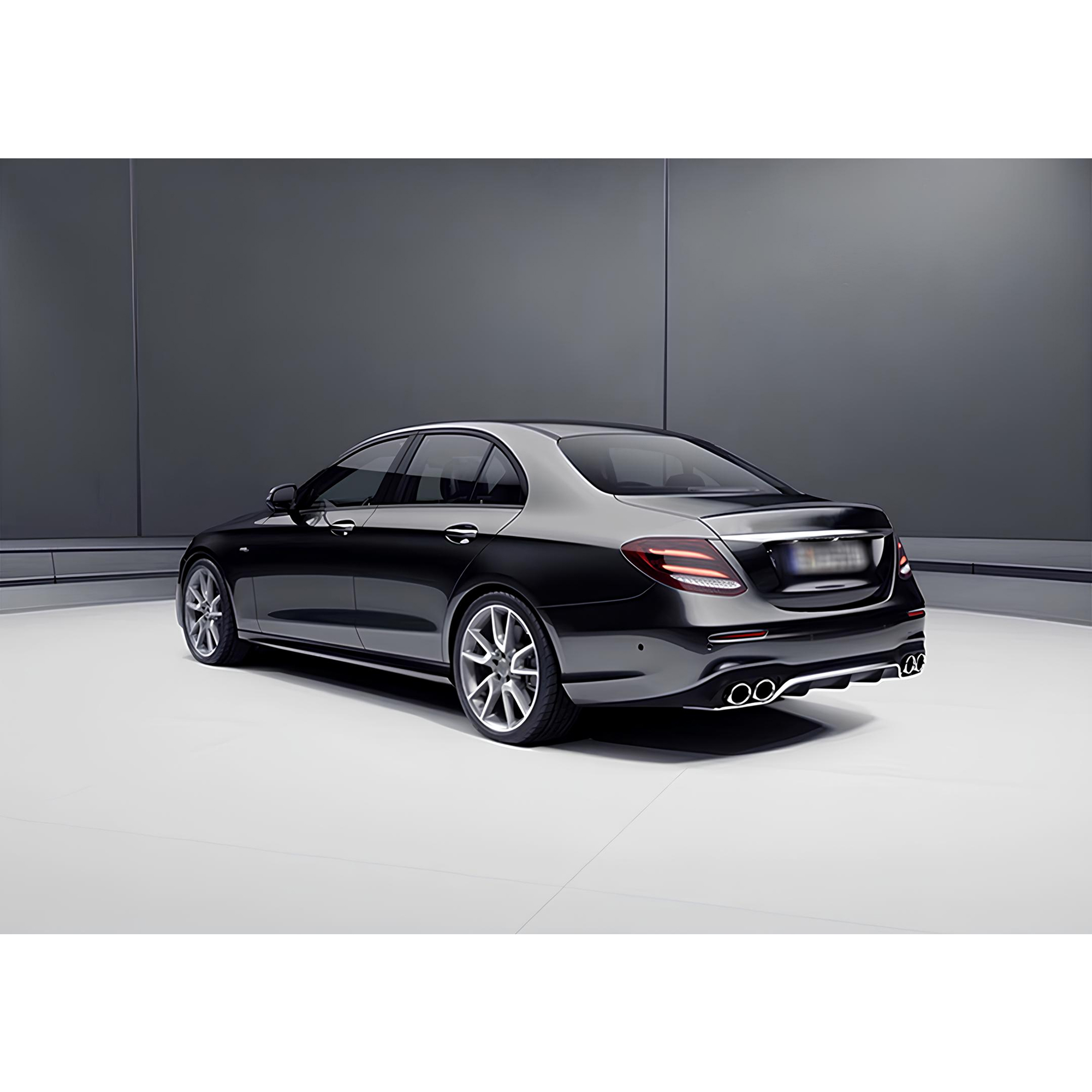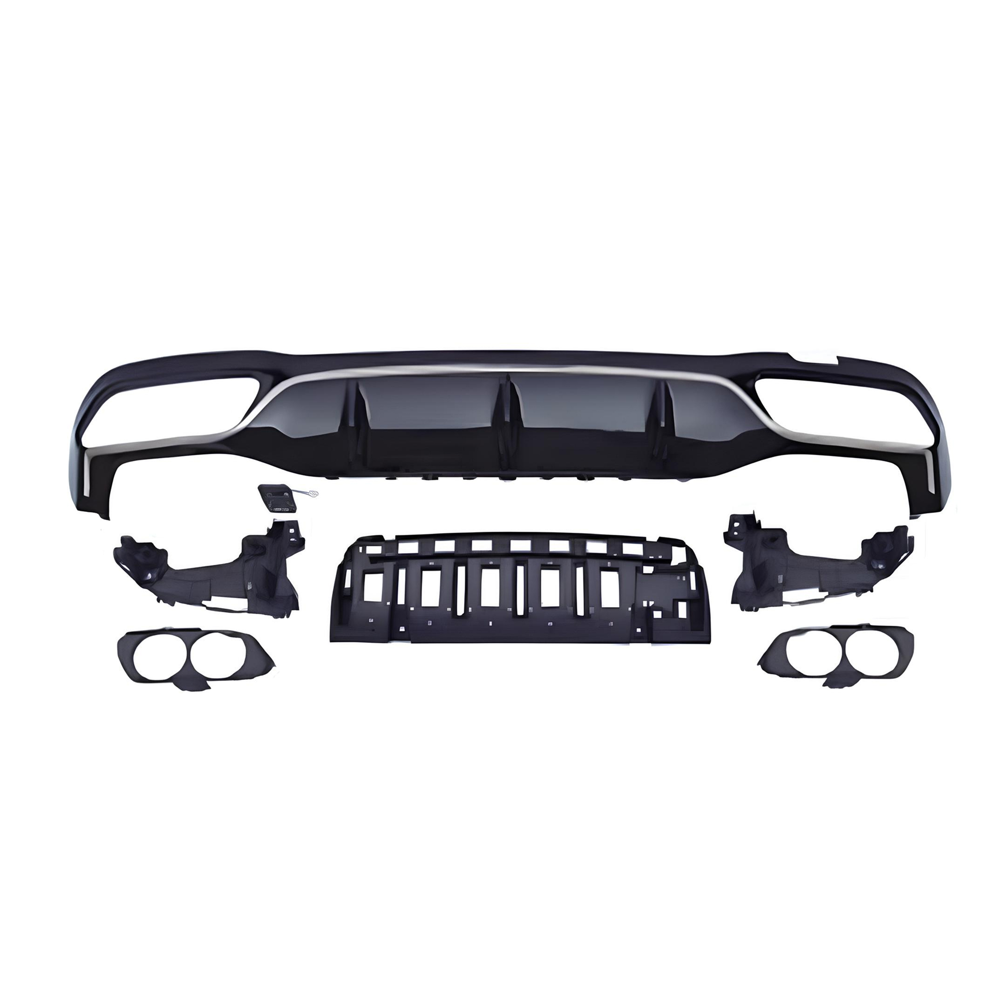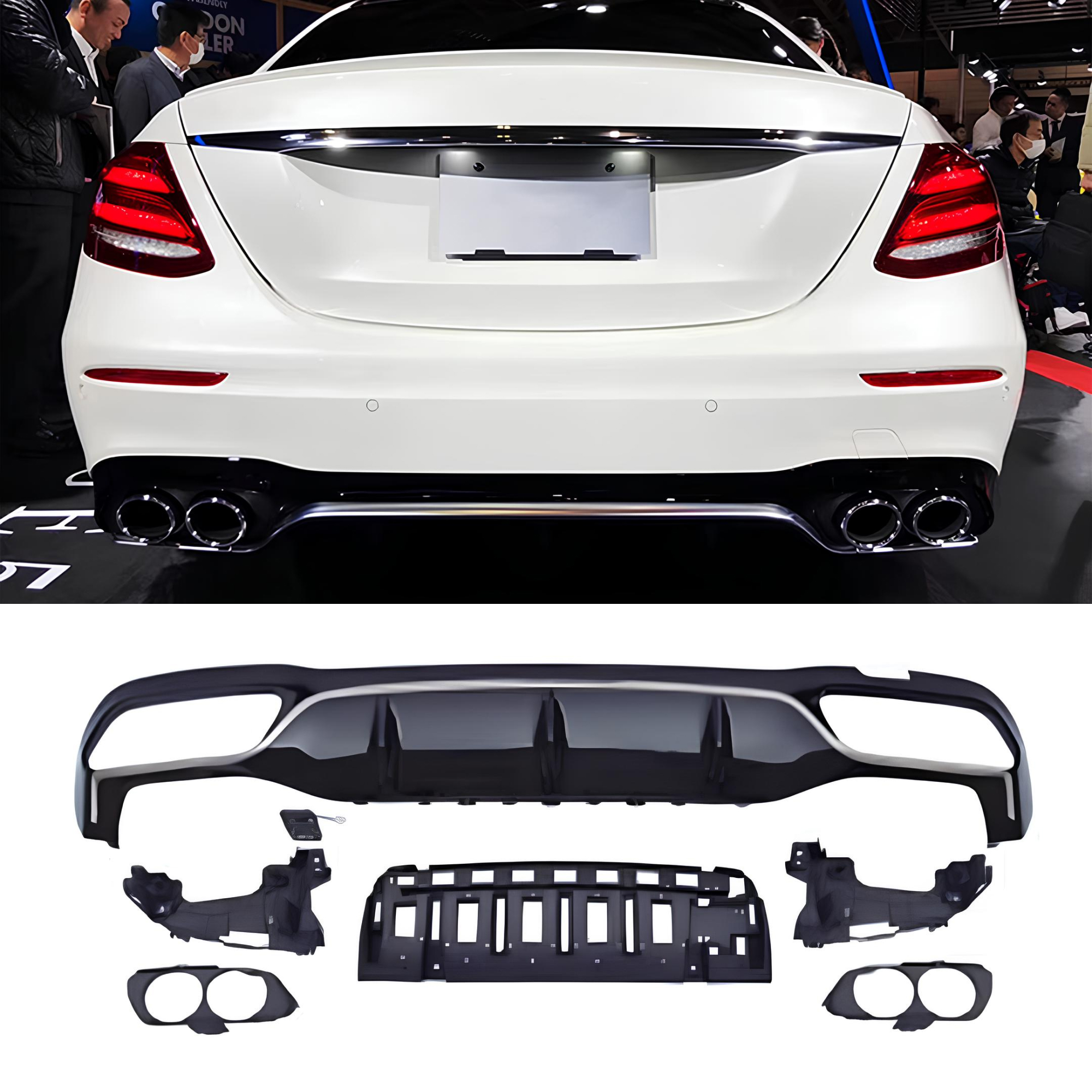 Sportowy dyfuzor tylny w stylu AMG Look, przeznaczony do modeli Mercedes-Benz W213 (2017+) z tylnym zderzakiem AMG. Wykończony w eleganckim kolorze czarny połysk z dekoracyjną srebrną listwą, nadaje pojazdowi agresywny i luksusowy charakter.