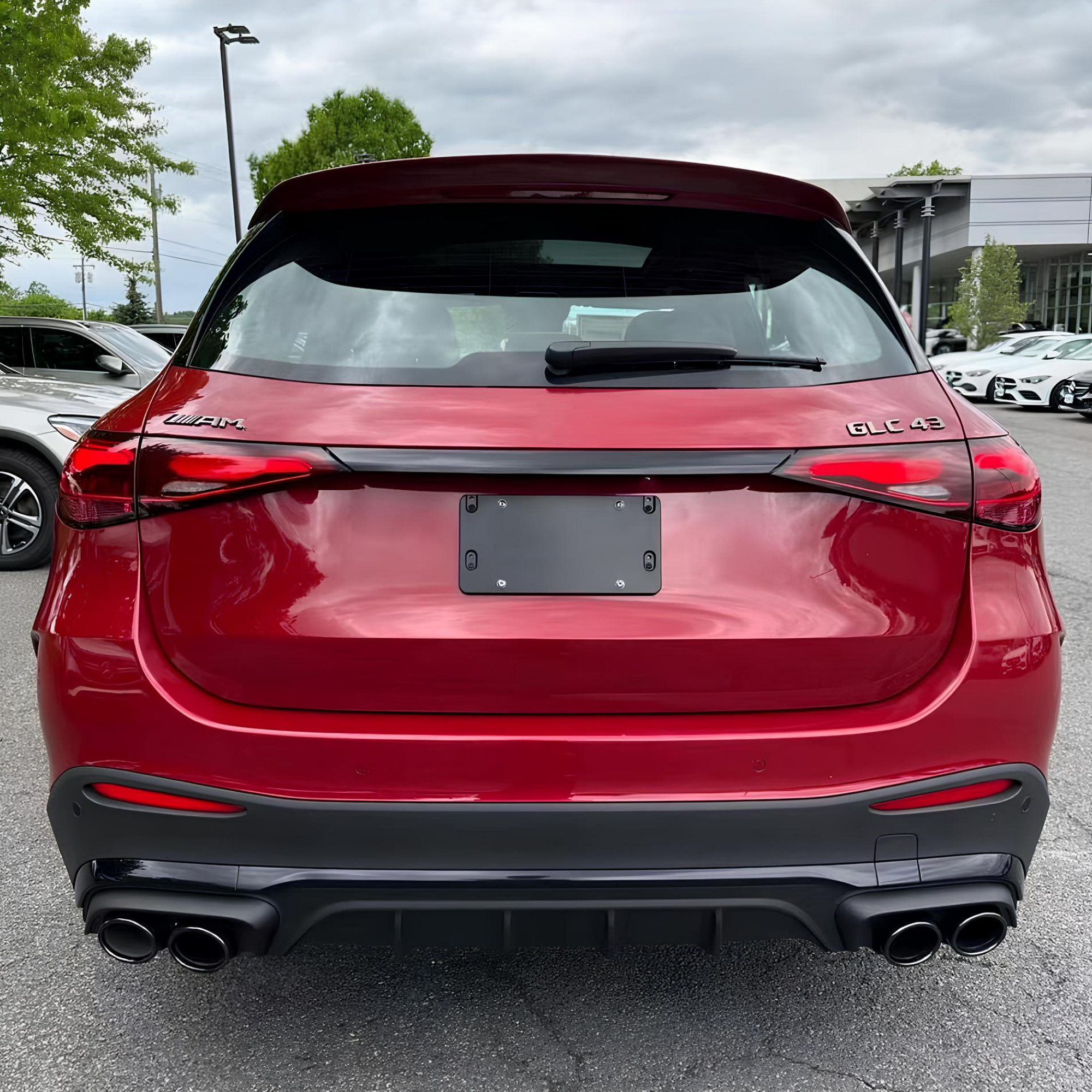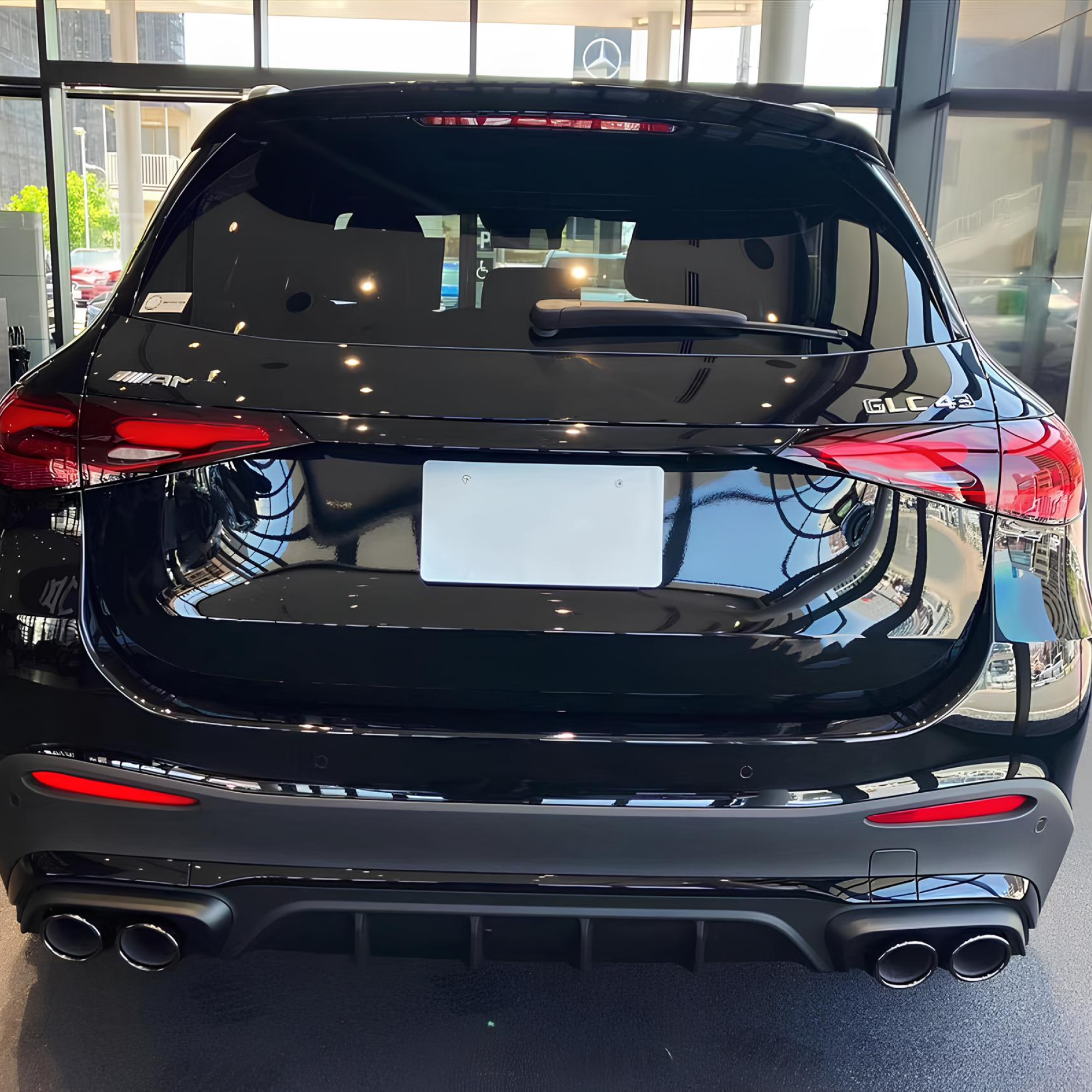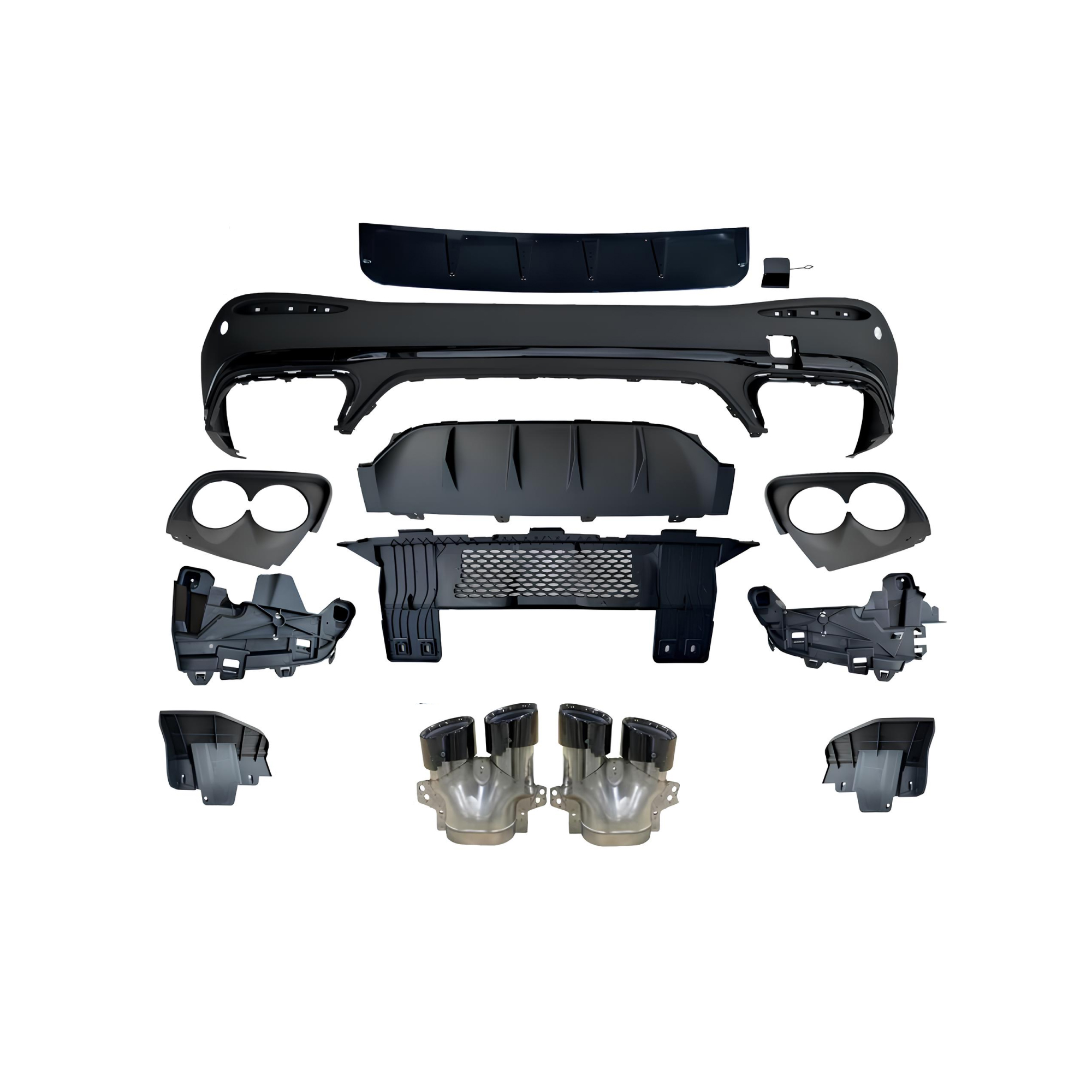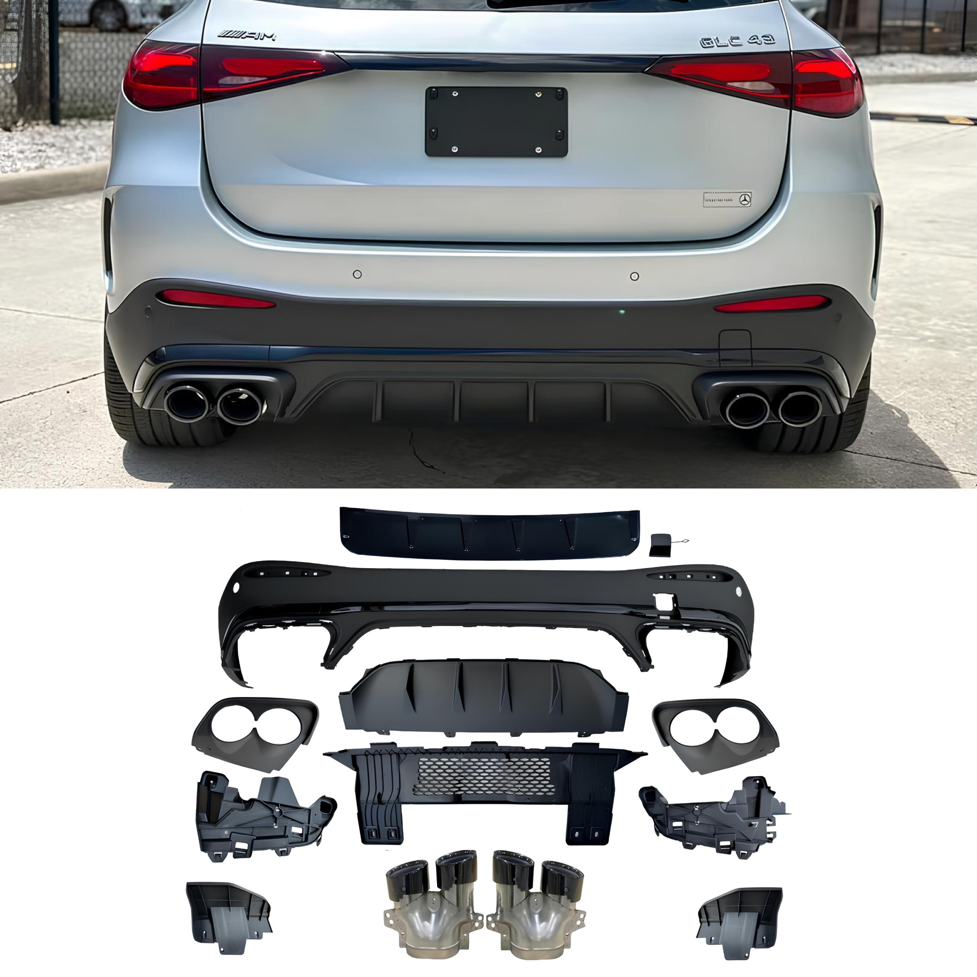 Sportowy i elegancki dyfuzor tylny w stylu C43 AMG, przeznaczony do modeli Mercedes-Benz GLC X254 (2023+) z tylnym zderzakiem AMG-Line. Wersja wyposażona w zestaw końcówek wydechu AMG, które podkreślają dynamiczny, sportowy i prestiżowy charakter pojazdu.