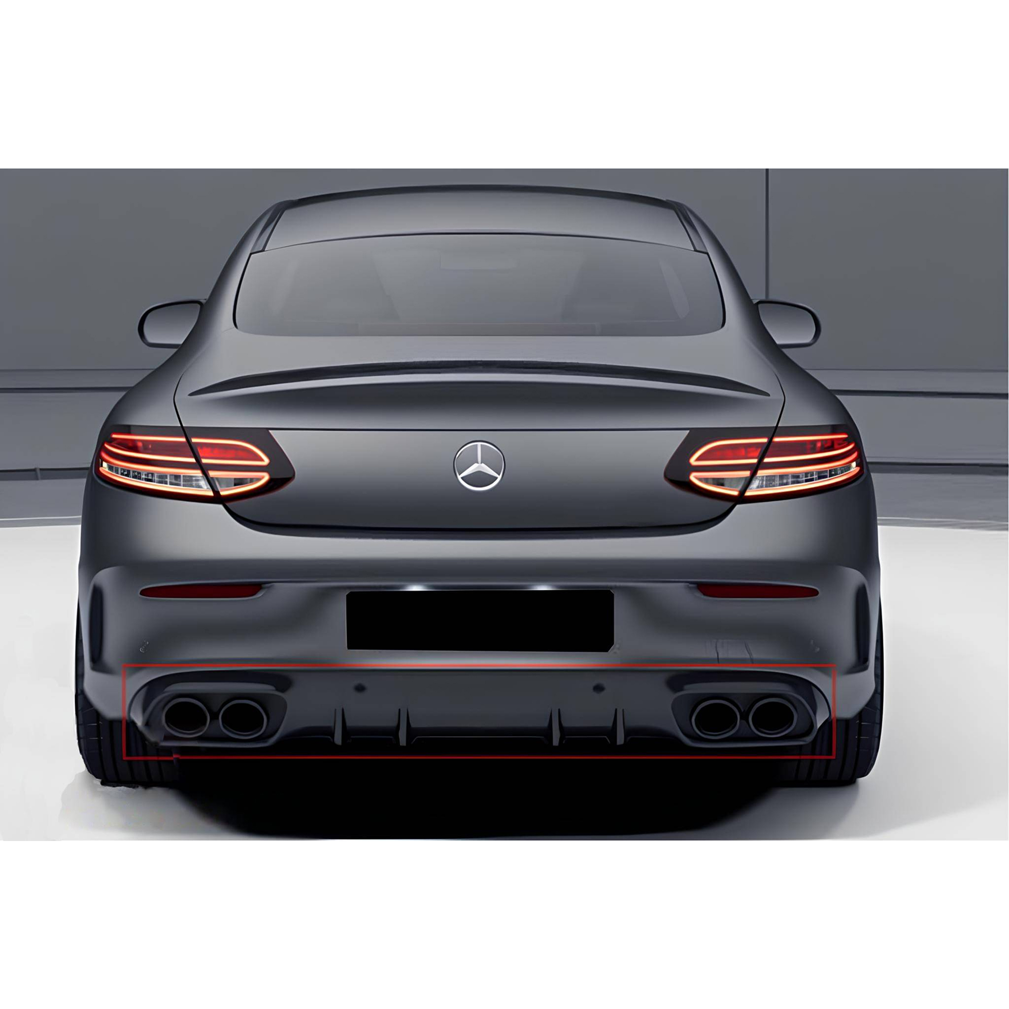 Sportowy dyfuzor tylny w stylu AMG C43 Look, przeznaczony do modeli Mercedes-Benz W205 (sedan) oraz C205 (coupe) z tylnym zderzakiem AMG. Wykończony w eleganckim kolorze czarny połysk, który podkreśla sportowy i dynamiczny charakter pojazdu.